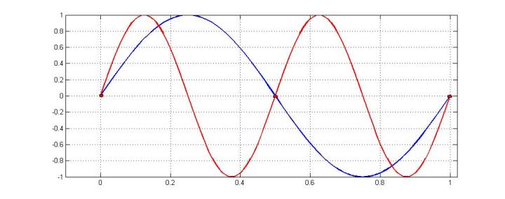 对于这三个点,我们不能确定它对应的正弦曲线是sin(2π/t),因为sin(4π/t)等倍频曲线也会穿过这三个红色采样点:
