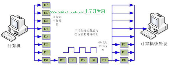 计算机是以并行的方式来处理数据的,通过串行发送数据时候,先由具有几位(8/16/32/64位)总线的计算机内的发送设备,将几位(8/16/32/64位)并行数据经并——串转换硬件转换成串行方式,再逐位经数据线到达接收站的设备中,并在接收端将数据从串行方式重新转换成并行方式,以供接收方使用,如图 3所示。串行通信时,数据的发送与接收需要时钟进行控制。