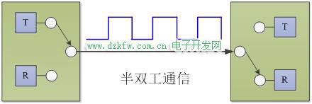 使用同一根数据线,即可发送数据又可接收数据,但同一时刻只能进行一个方向的传送,如图 11所示。半双工通信每端需要一个收/发切换电子开关,在切换时,也会产生延迟。如我们的对讲机、USB、打印机串口外设等。