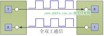 在两个站点之间传输数据中,数据的发送和接收分别在两根数据线上同时进行,通信双方都能在同一时刻进行数据的发送和接收操作如图 12所示。通常在交互式应用、远程检测控制场景。如电话通信、上网(登录某个网站,进行上传、下载文件)、两台计算机通过网线传送文件电影等。