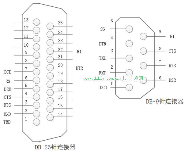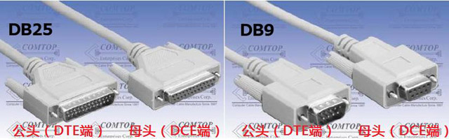 标准规定DB25或DB9连接器公头做为DTE设备端接口插座DB25或DB9连接器母头做为DCE设备端接口插座,如图 13所示。