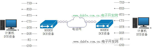 RS-232C最初设计为计算机(称为数据终端设备DTE--Data Terminal Equipment和数据通信设备DCE--Data Communication Equipment(如MODEM)的连接,如图 15所示。