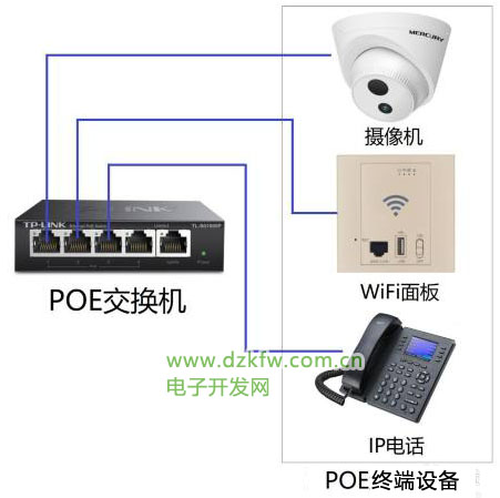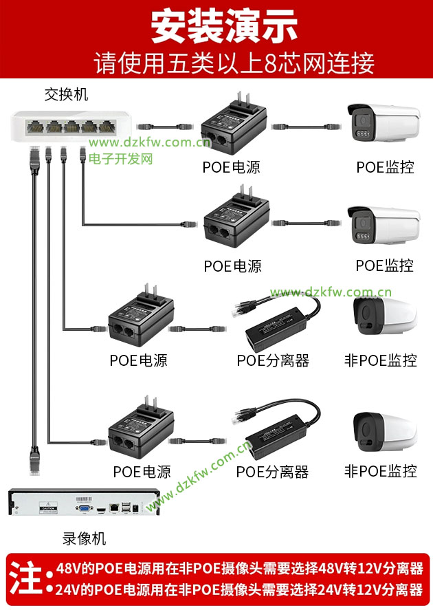 交换机不支持POE供电,可选用POE供电模块代替,网线的线序使用T568B