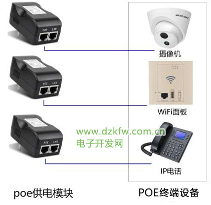 POE (Power Over Ethernet)以太网供电,网络为终端传输数据信号的同时,还能为设备提供直流电源,常用终端有IP电话、摄像机、WiFi模块。下面介绍两种网线接法: