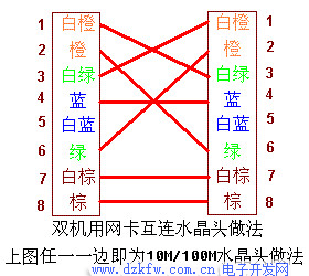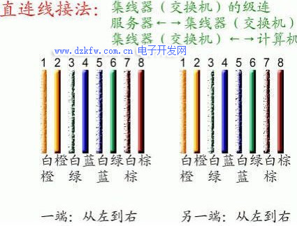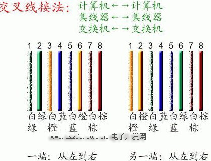 2)在进行间HUB级连时,应把级连口控制开关放在MDI(Uplink)上,同时用直通线相连。如果HUB没有专用级连口,或者无法使用级连口,必须使用MDI-X 口级连,这时,我们可用交叉线来达到目的,这里的交叉线, 即是在做网线时,用一端RJ-45 plug 的1脚接到另一端RJ-45 plug 的3脚;再用一端RJ-45 plug 的2脚接到另一端RJ-45 plug 的6脚。可按如下色谱制作: