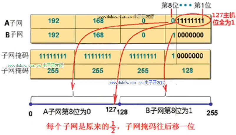 192属于C类IP, 划分一位子网, 那么子网掩码为255.255.255.128, 主机可用地址192.168.0.129 -- 255, 2^7 - 1个地址