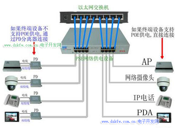 POE也被称为基于局域网的供电系统(POL, Power over LAN )或有源以太网( Active Ethernet),有时也被简称为以太网供电,这是利用现存标准以太网传输电缆的同时传送数据和电功率的最新标准规范,并保持了与现存以太网系统和用户的兼容性。