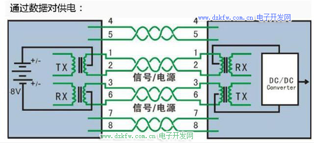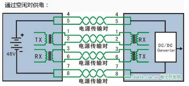 通过空闲对供电,应用空闲脚供电时4、5脚连接为正极,7、8脚连接为负极。 通过数据对供电,利用信号线(1,2,3,6)同时传递数据信号和48V的电源