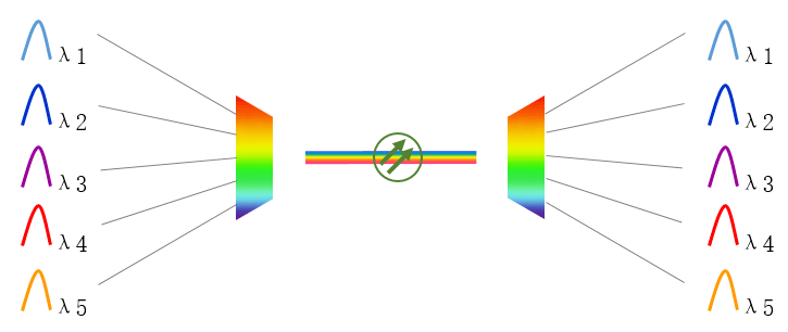 偏振复用的道理,其实也差不多。它利用光的偏振维度,在同一波长信道中,通过光的两个相互正交偏振态,同时传输两路独立数据信息,以此达到提升系统总容量的目的。