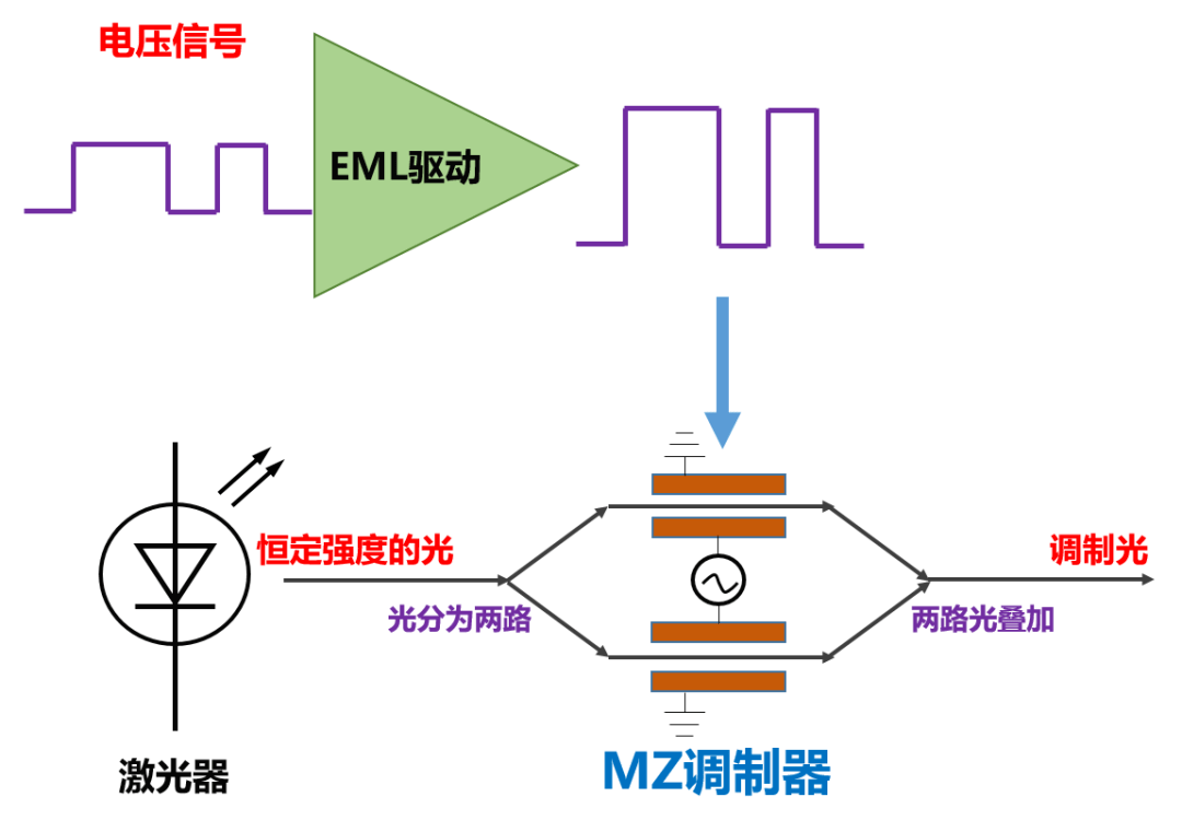 在MZ调制器中,输入的激光被分成两路。通过改变施加在MZ调制器上的偏置电压,两路光之间的相位差发生变化,再在调制器输出端叠加在一起。
