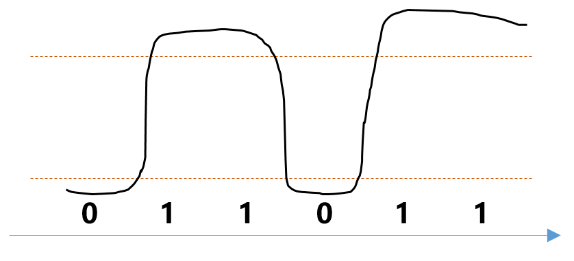 所谓“不归零”,不是说没有“0”,而是说每传输完一位数据,信号无需返回到零电平。(显然,相比RZ,NRZ节约了带宽。)