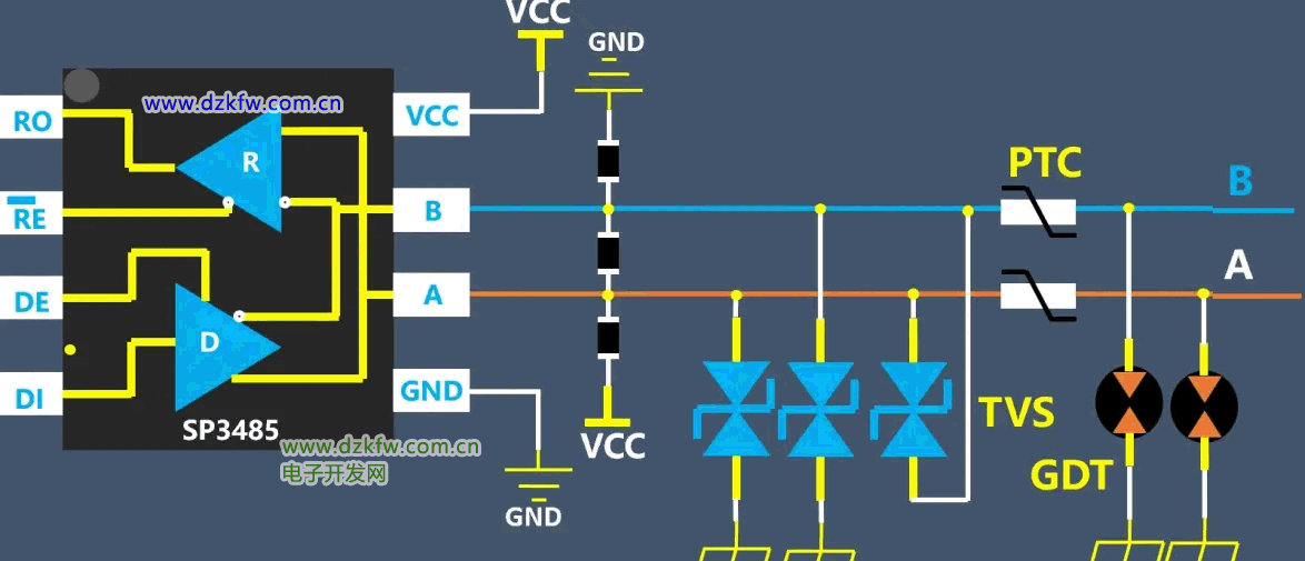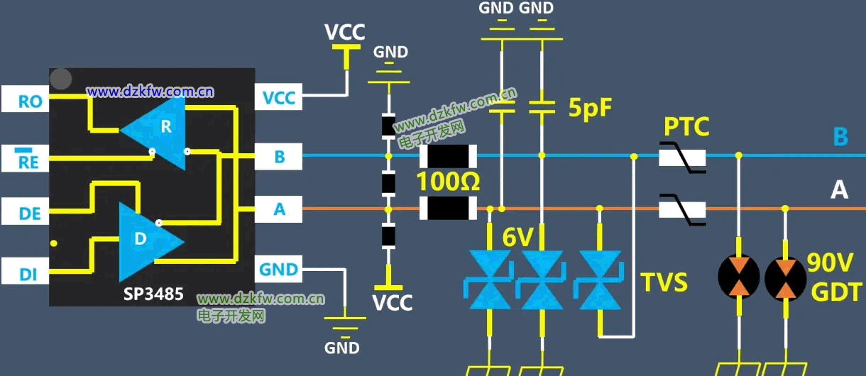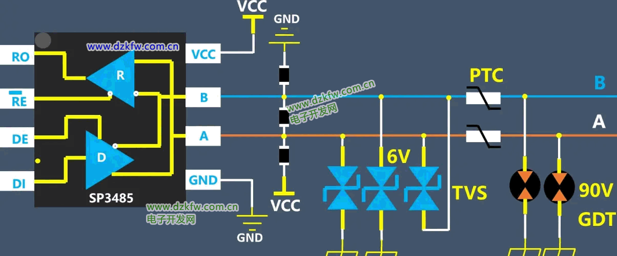 非隔离的485信号典型的防护电路就是这个,防护器件包括气体放电管,PTC自恢复保险丝,TVS管等。