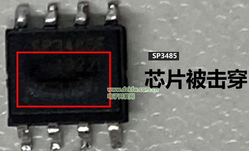 仔细观察测试浪涌后损坏的485收发器芯片发现,外观损坏程度并不是太大,没有出现大面积的损坏,初步估计是浪涌经过防护器件后还是会有比较大的残压进入到485收发器芯片,从而导致收发器芯片过压损坏。