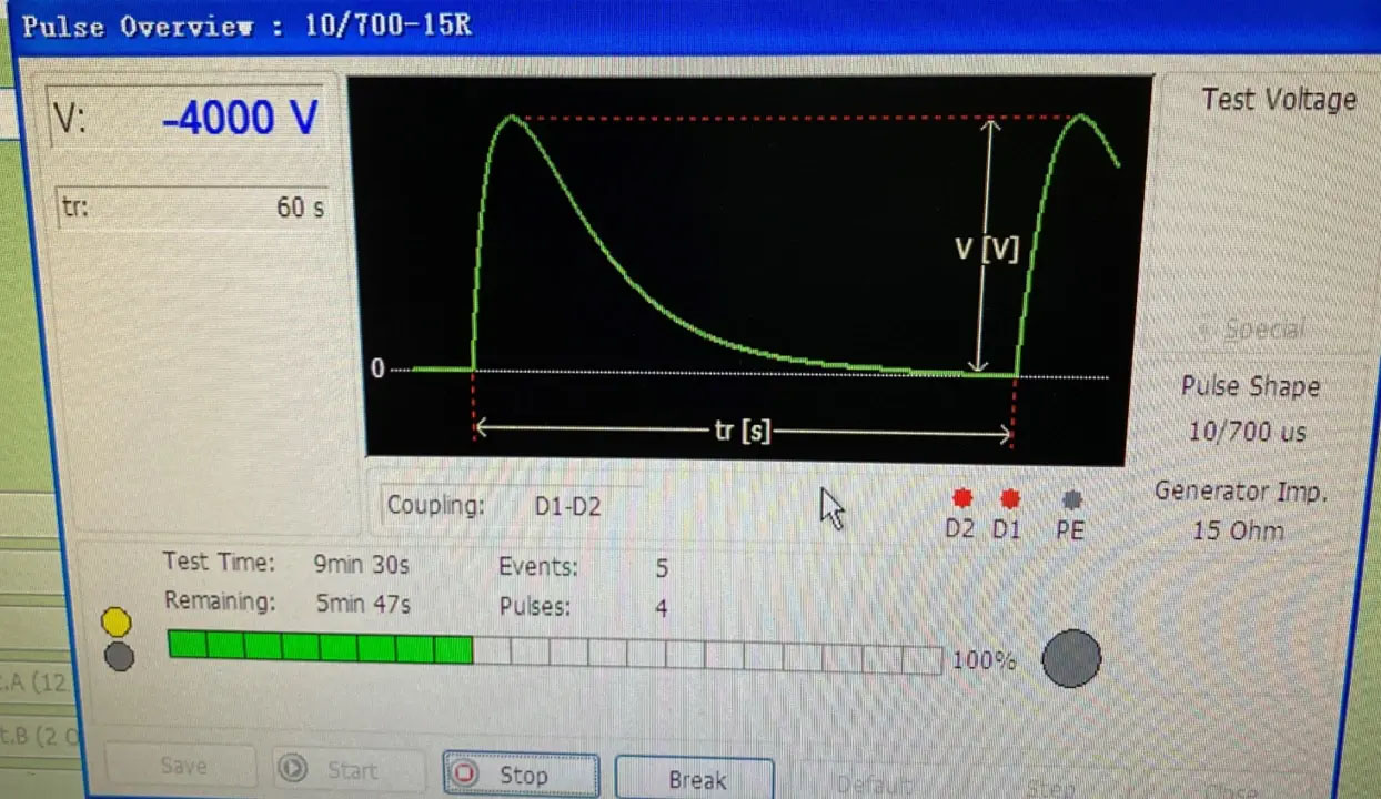 浪涌测试采用10/700的波形,测试电压为正负4KV。