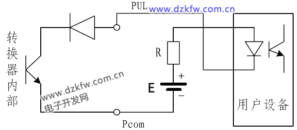 一般情况下,流体总是向一个方向流动,这时,用户仅使用输出接点和地线接点就可以了。若用户需要知道流体流动方向,则使用流体方向接点来完成。PUL+、PDIR信号共用地线PCOM、PUL+和PDIR均集电极开路输出,用户接线时可参照如下电路: