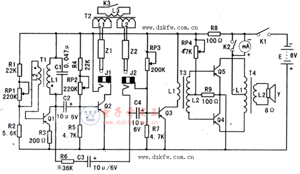 电路中的R6、C3组成正反馈电路。它的作用是将检测变压器中绕组L2中感应到的微弱音频信号电压反馈到Q2基极进行再放大,适当选择R6的数值可以调节测试仪的检测灵敏度。图中RP1为振荡器工作电流调节可变电阻.在电路制作完成后,将检测变压器铁心接触某其它变压器铁心,使主磁路接通。然后调节RP1,使振荡器起振(Q1正常工作电流为0.4~0.6mA)。若元件正常,安装无误,晶体管的工作点设置合适。应能听到扬声器发出的音频叫声。改变c1容量或振荡变压器T1的初级绕组L1匝数可改变振荡频率(即改变扬声器发出声音的声调)。图中RP2为放大管Q2 工作电流调节可变电阻,改变其阻值可调节测试仪的检测灵敏度。在电路制作完成后.调节RP2.使检测变压器铁心接触待测电机线槽嵌入线圈的铁心时(可人为将线圈短路),扬声器恰好停止发声或音量大幅减小。图中RP3为推动管Q3工作电流调节可变电阻,改变其阻值使Q3集电极工作电流为2mA~3mA即可(实际上也有调节测试仪检测灵敏度的作用)。图中RP4为功放级静态工作点电流调节可变电阻.改变其阻值使静态工作电流为2mA~4mA即可(可在K2断开时,在K2两端并联毫安表进行监测)。在测试仪各级工作电流确定正常后,RP1~RP4可换成固定电阻,以防日久可变电阻变质(值)影响测试仪工作。振荡变压器T1可用10K型中周“工”字型磁心作为骨架,L1用φ=0.07mm高强度漆包线绕60匝,L2用φ=0.07mm高强度漆包线绕6匝,并注意两绕组绕向正好相反。检测变压器T2用100VA变压器用“U”形铁心(若是用于检测小型电机,则T2铁心可根据实际情况确定。),铁心截面积2x3cm2.L1用φ=0.21mm高强度漆包线绕100匝,L2用φ=0.21mm高强度漆包线绕200匝。推动变压器T3可用上世纪80年代生产的晶体管收音机用小型输入变压器,初次级匝数比为2:1,若要自制.可用“E”型铁心,铁心横截面积5x5mm。,初级L1用φ=0.1mm高强度漆包线绕100匝,次级L2用φ=0.07mm高强度漆包线绕50匝,在25匝处抽头接R9。输出变压器T4也是用上世纪80年代生产的晶体管收音机用小型输出变压器.初次级匝数比为8:1.若要自制,也用上述输入变压器同样的铁心,初级L1用φ=0.1mm高强度漆包线绕200匝,在100匝处抽头接K3,次级L2用φ=0.1mm高强度漆包线绕25匝,扬声器可用φ=65mn/0.25W/8Ω,永磁式扬声器。晶体管Q1~Q5均用上世纪80年代生产的晶体管收音机用的锗三极管,其中Q1为3AG11.要求β>100,Q2~Q5用3Ax31A/B,要求β>50。若手头没有这类管子,也可用常用的硅管。Q1采用S9015.要求β>100,Q2、Q3采用S9012,要求β>80,Q4、Q5用S8550,要求β>50,其余元件见附图标注。开关K1、K2均采用小型扭子开关,插头、插座均采用小型耳寨机常用φ=2.5mm插头、插座。电流表可用量程100mA/91L16型小方型塑壳电流表。若不需要电流表显示,也可不用。由于测试仪不经常用,为减少测试仪体积。故电源采用4节5#碱性电池。整个测试仪电路元件可安装在85x40mm2的印板上.然后再将电路板装入90x45x30mm3的塑料机盒内。插座J1、J2、开关K1、K2及扬声器Y均安装在上盖板上,扬声器所在位置上盖板应用φ=2.5mm钻头钻若干个均匀分布的小孔.小孔面积应与扬声器纸盆面积相当。检测仪通过插头Z1、Z2、插座J1、J2与主电路板连接。插头z1、Z2引线最好采用带金属屏蔽的双芯软线,长度应大于1.5米。使用时将插头z1、z2插入插座J1、J2插孔,将电源开关置于“开”位置,就可进行检测了。测试完毕后.拔出捕头Z1、Z2.将电源开关置于“关”位置即可。