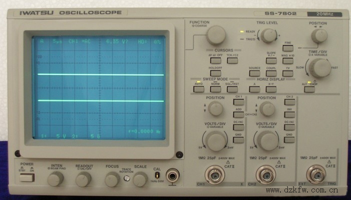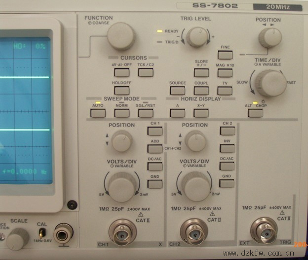 (4)峰值自动(P-P AUTO):无信号时,屏幕上显示光迹;有信号时,无需调节电平即能获得稳定波形显示。该方式只有部分示波器(例如CALTEK卡尔泰克CA8000系列示波器)中采用。