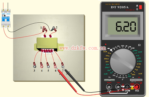 第四步:将万用表挡位旋转至交流电压挡20V量程,分别测量3-4,4-5,6-7各点之间的电压,并记录读数。