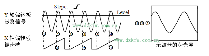 故对于模拟示波器,Y偏转板上应施加待测信号,X偏转板上应施加锯齿波信号(扫描信号)。但仅靠上述描述,还不足以将信号波形稳定的显示在示波器屏幕上。当X轴偏转板锯齿波自动触发时,由于触发位置的不确定,使得观察者在示波器上看到的波形好像是在滚动,且有多条波形重叠。