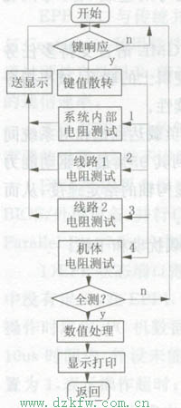 如图5所示,单片机采用查询方式响应测试键控。用4个键对应四个测试状态,且及时显示测试结果以便于操作者判断。程序判断四个电阻测试完后,自动修正各种误差,显示并打印出所测得的机体电阻值,并附带其他信息,以便于保存和验证。