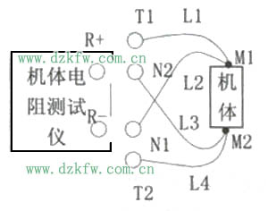 测试原理是四线测试法。选择L1~L4四根导线为相同导线电阻的镀银导线。M1、M2为机上测试连接点。在同一个测试点上拧紧两根测试线,L1和L2,L3和L4。导线的另一端接至测试接线盒的接触电阻小于0.05毫欧的φ6镀金接线柱。采用手动连接活动镀金接线片的办法,构成三种测试状态:R+接T1、R―接N1,测量出L1、L2及接触点M1的接触电阻;R+接N2、R―接T2,测量出L3、L4及接触点M2的接触电阻。将这两个电阻值取平均值作为测试线路的系统误差。最后测出R+接N2、R―接N1的电阻值,减去上述测得的测试线路系统误差,即得到机体电阻值。