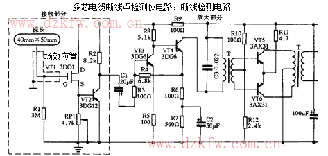 多芯电缆断线点检测仪可对多芯电线、橡皮线等在不破坏内部结构的情况下,测出断线故障点。其工作原理如下图所示,虚线内为接收部分,后一部分为扩音放大部分。检测电线故障点时,把认为断线的那根电线接入220V的相线上,使探头(用铁皮剪成的圆圈制成)靠近被测线线皮上慢慢移动,这时扬声器里会有交流声。待移动到交流声中断处时,则是电线的断点位置。
