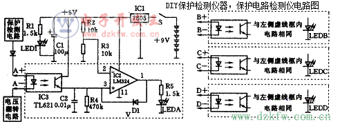 自制的保护检测仪器电路图见图下。保护电路检测仪电路图工作原理: