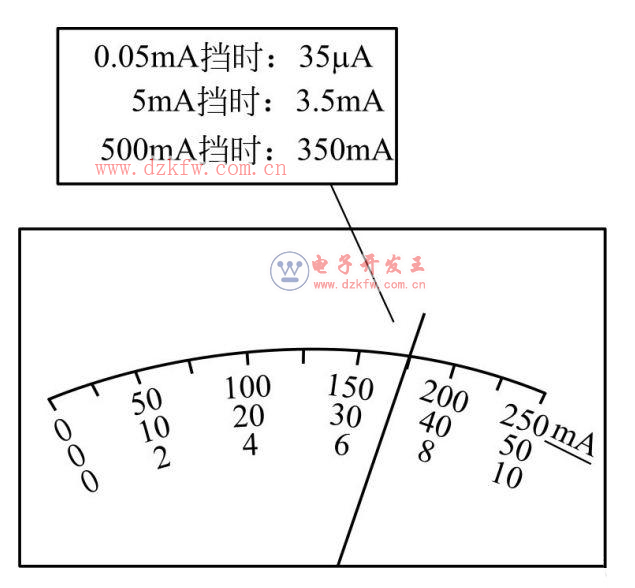 下图中,当测量选择开关位于“0.05mA”档时,指示值为35uA,当测量选择开关位于“5mA”档时,指示值为3.5mA,当测量选择开关位于“500mA”档时,指示值为350mA,以此类推。