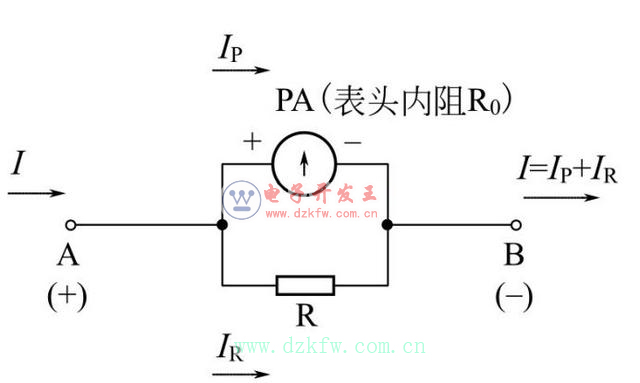 I分为流过表头的电流Ip,和流过分流器的电流IR两部分,分配比例由表头内阻R0与分流器R的阻值比的倒数决定。表头PA按比例指示电流的大小。