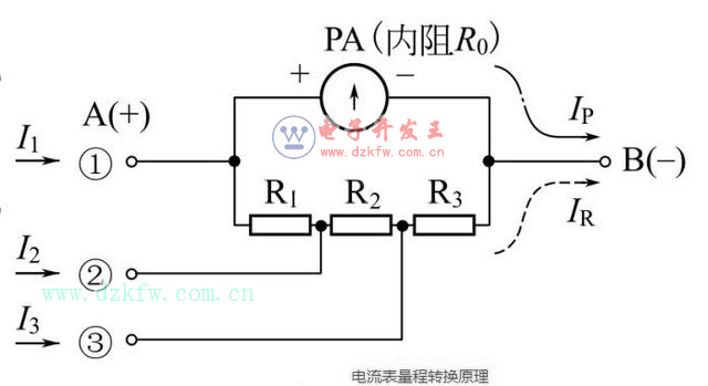 当被测电流I1从A①端输入时,IP支路电阻为R0,IR支路电阻为R1+R2+R3。而当被测电流I3从A的3端输入时,Ip支路的电阻为R2+R1+R0,IR之路的电阻为R3。可见,当表头指示相同(IP相同)时,I3>I1,扩大了量程。