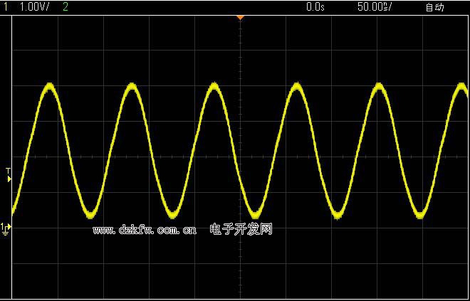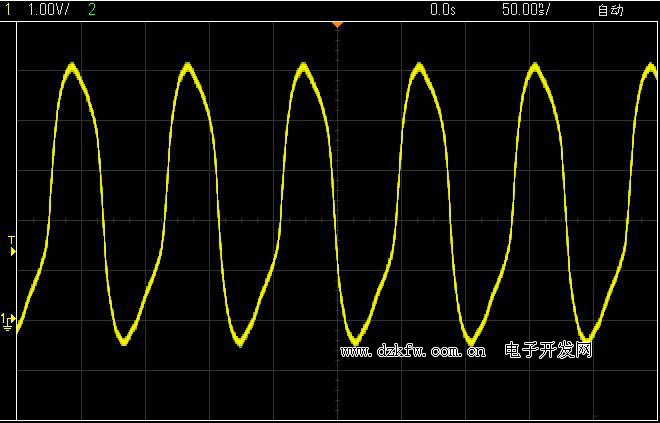 只要经过上述的这三四步,你就可以把示波器的核心功能应用起来了,可以用它观察单片机系统的各个信号了。比如说上电后系统不运行,就用它来测一下晶振引脚的波形正常与否吧。需要注意的是,晶振引脚上的波形并不是方波,而是更像正弦波,而且晶振的两个脚上的波形是不一样的,一个幅值小一点的是作为输入的,一个幅值大一点的是作为输出的,如图7所示。