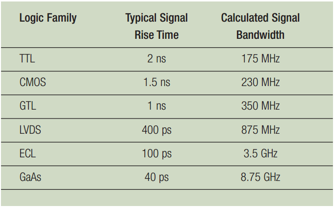 根据示波器不同的频率响应特点,带宽小于1GHz的高斯响应示波器的k值一般取0.35,带宽大于1GHz最大平坦度响应示波器的k值在0.4到0.45之间。表1列出常见逻辑电平不同上升时间对应的带宽选择。