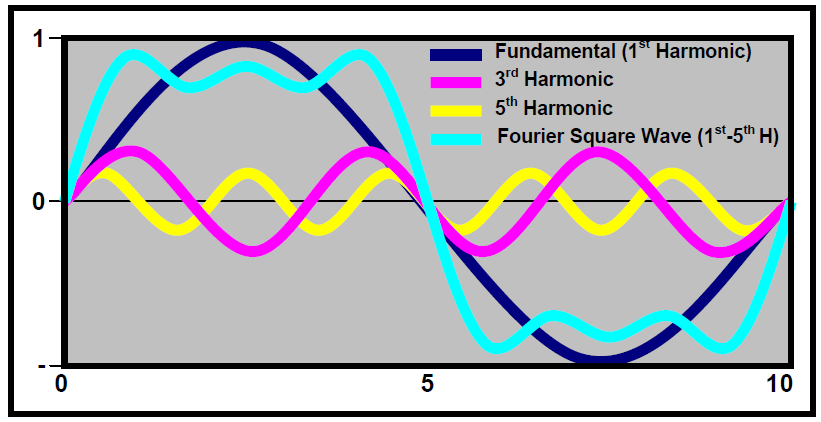 除正弦波外,其它波都可以看作不同频率正弦波加权叠加而成。方波是由基波与无数奇次谐波叠加所构成。方波是理想波形,我们近似方波只用前几个谐波叠加,叠加的奇次谐波频率越高,实际波形的上升波形越陡峭,就越接近理想方波。