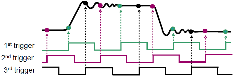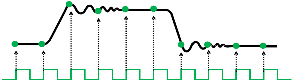 在测量高频信号时,示波器可能在一次扫描中无法捕获足够的采样点。当待测信号频率大于示波器采样率的1/2时,可以选择等效采样示波器。等效采样仅测量采样瞬间波形的瞬时幅度。与实时示波器不同,等效时间采样示波器的每次触发只对输入信号采样一次。下次触发示波器时,会增加一个小小的延迟然后进行下一个采样。预期的采样数决定重新生成波形所需的周期数。等效采样仅对重复信号有效,通过大量在不同时间点/相位的采样值,重构信号的完整波形,如图9所示。