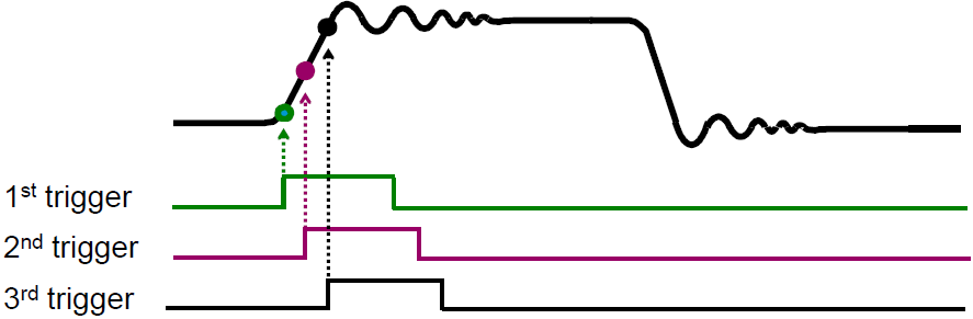 随机等效采样的第一组采样点是在随机时刻采集的,而与触发事件无关,这些采样(第N组)点是基于示波器内部时钟的,与测试信号无关。当示波器在等待触发事件到来时,其内部就在连续地采样并将结果存储起来。当一个触发事件到来时,示波器内一个定时系统就从这个时刻开始数据的采样直到下个触发事件开始下一组数据的采样。由于采样间隔是固定的,示波器能够据此计算出所有采样点在存储器中的位置。当第一次采集所有的采样点存储完毕以后,就开始采集一组新的采样点并等待新的触发事件,新触发时间到来以后,计时系统进行新的时间测量并计算出这些新的采样点位置,这些新采样点落在第一次采样点之间未填充位置,用这种方法,测量的波形由X轴上随机位置出现的一组组采样点构成。随机等效采样的过程如图10所示。