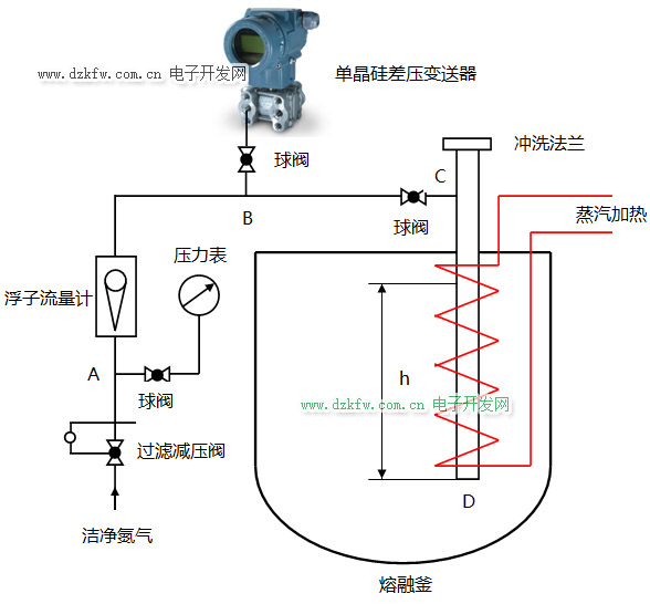 如图所示:在敞口的溶融釜中插入一根导管,压缩氮气作为气源,首先经过过滤减压使压力PA降至某一恒定值,然后再经过流量计限流,其流量大小由浮子流量计指示。最后恒流气体从导管下端开口处逸出,均匀鼓泡通过液体进入大气。在忽略管内气柱静压的情况下:p=ρ×g×h,则h=p÷(ρ×g),从而可以推导出液位高度h(单位:m)。公式中p压力变送器测量值(单位:Pa);ρ为可以通过查询得到的介质密度(单位:kg/m3);g为9.8m/s2。