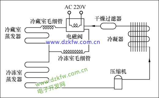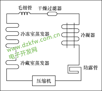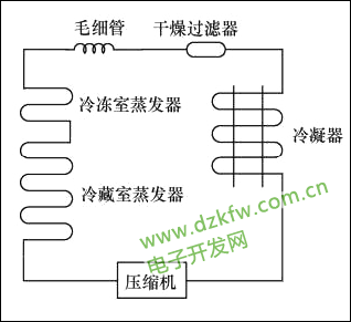 1构成制冷系统由压缩机、干燥过滤器、冷凝器、电磁阀、冷藏室毛细管和冷冻室毛细管、冷藏室蒸发器和冷冻室蒸发器等组成,与一般的双门直冷式冰箱的制冷系统相比增加了一个毛细管、一个电磁阀。典型的双温双控制冷系统如图7、图8所示。