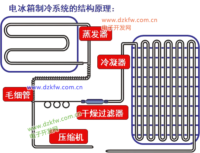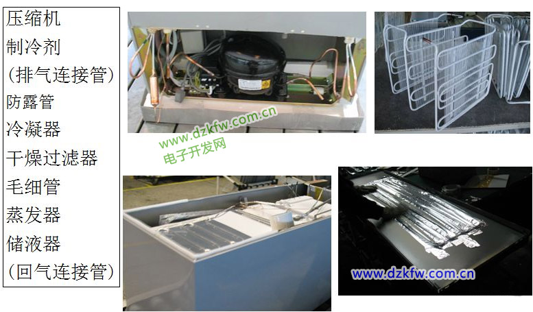 电冰箱的制冷系统主要包括蒸发器、冷凝器、毛细管、干燥过滤器和压缩机