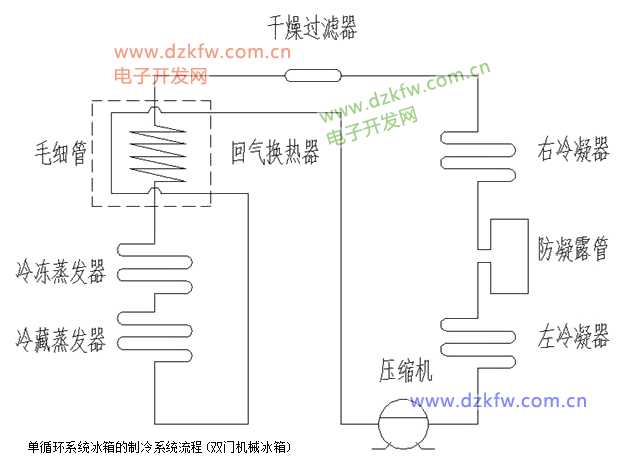 1、单循环系统冰箱的制冷系统流程(双门机械冰箱)
