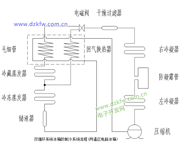 2、双循环系统冰箱的制冷系统流程(两温区电脑冰箱)