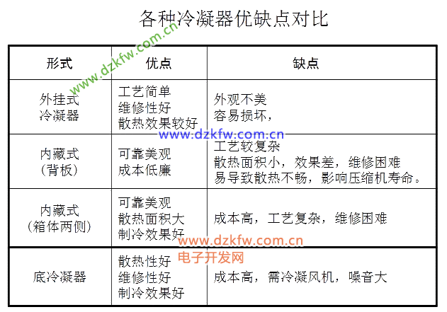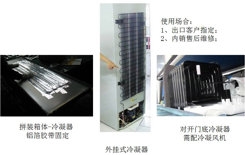 冷凝器包括侧冷凝器、背冷凝器、底冷凝器等,除露管也是冷凝器的一种,但其主要作用是防止冰箱门封处的凝露。