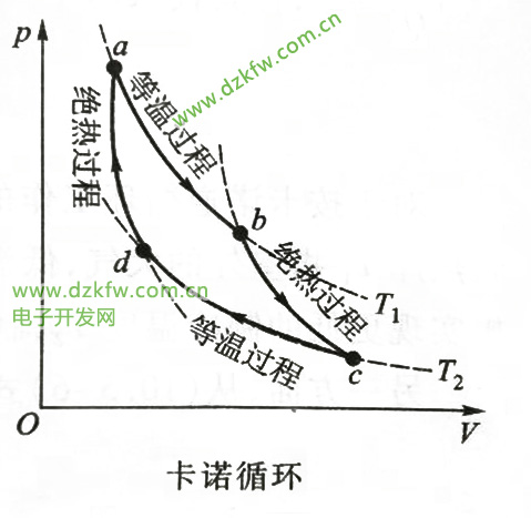 4→1,等熵(可逆绝热)压缩:移开低温热库,此绝热的过程系统对环境作负功,系统在此过程后回到原来的状态。