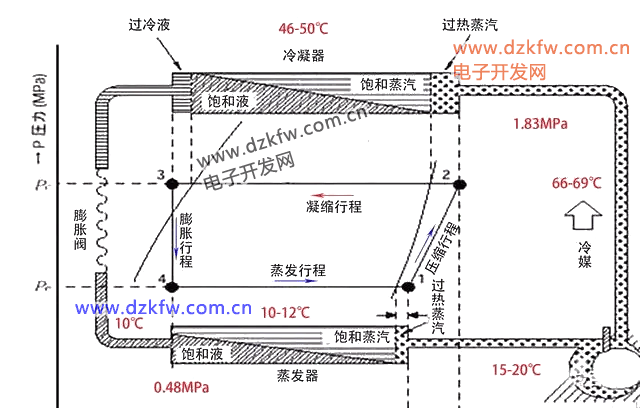制冷剂温度在临界温度和相应的临界压力之内都遵循这一规律。氟利昂R22的临界温度是96.15℃,相应的临界压力是4.99MPa。