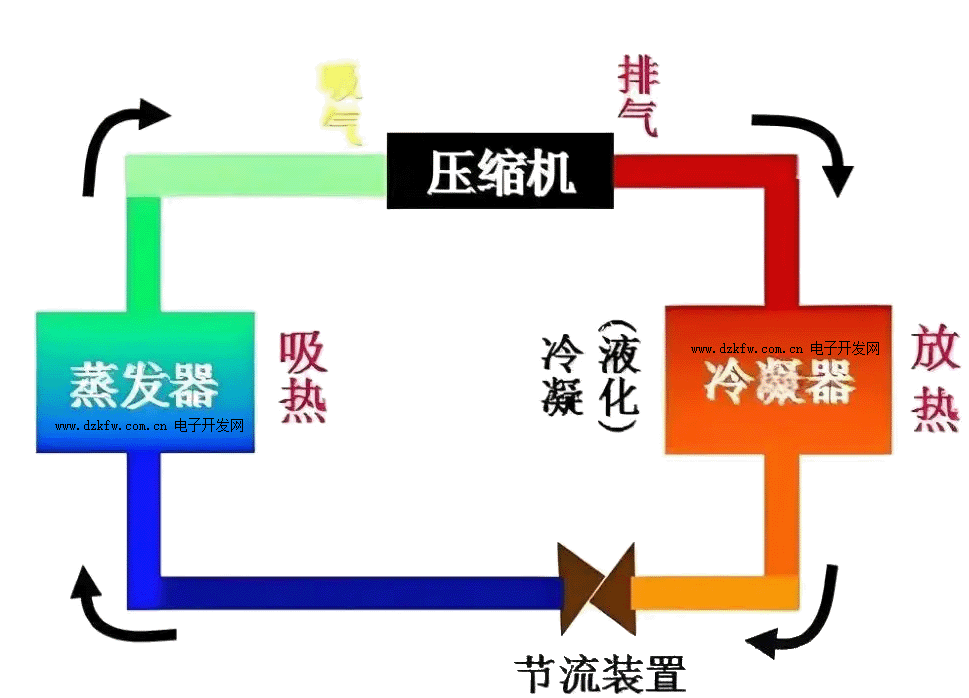 制冷技术的基本原理是利用某种工质(制冷剂)的状态变化,从较低温度的热源吸取一定的热量,通过一个消耗功(机械能或电能)的补偿过程,向较高温度的热源放出热量,从而实现制冷。