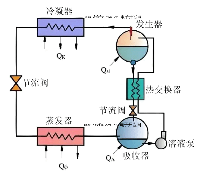吸收式制冷利用吸收剂对制冷剂气体的吸收和释放来实现制冷循环。这种制冷技术不需要压缩机,因此运行平稳、噪音低。但其缺点是制冷效率相对较低,且设备复杂、成本较高。吸收式制冷系统包括制冷剂回路和溶液回路两个回路。制冷剂回路中,高压制冷剂气体在冷凝器中冷凝成液体,经节流后进入蒸发器蒸发制冷。溶液回路中,吸收剂吸收来自蒸发器的低压制冷剂蒸气,形成富含制冷剂的溶液。溶液经加热后释放出制冷剂气体,重新进入制冷剂回路。
