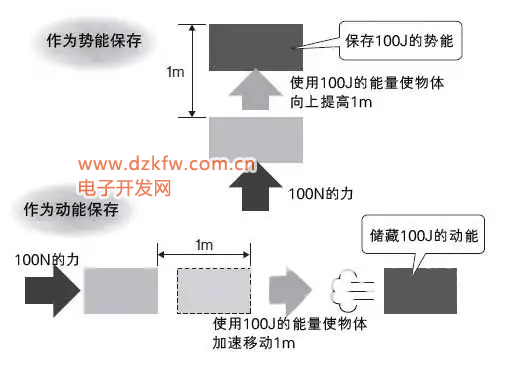 比如,100J的能量可在100N力的作用下将物体移动1m。使该“物体移动”后,能量并不是消失了。比如,使用能量向上提升物体时,能量会以位能的形态保存在物体中。使用能量使物体加速运动时,则以动能的形态保存在物体中。