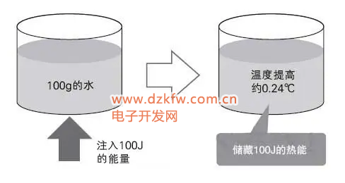 100J的能量可使100g水的温度升高约0.24℃。这并不是通过升高水的温度消耗了100J的能量。而是在水中作为热能保存了起来。