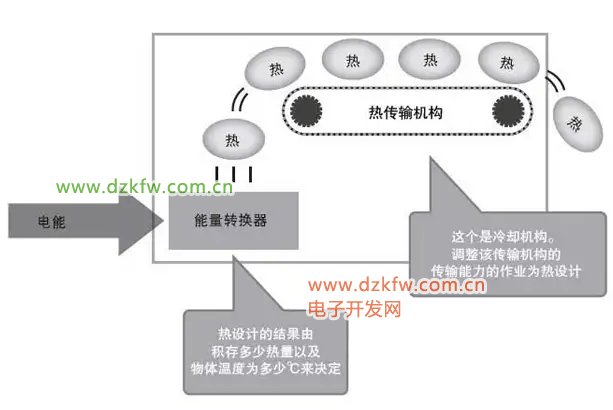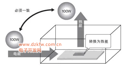 接通电源后一段时间内,多半转换的热能会被用于提高装置自身的温度,而排出的能量仅为少数。之后,装置温度升高一定程度时,输入的能量与排除的能量必定一致。否则温度便会无止境上升。