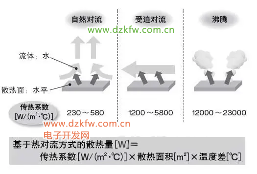这也可用数值表示。比如,流体为水,散热面水平放置时,自然对流就为(2.3~5.8)×100,受迫对流就为(1.2~5.8)×1000,水沸腾时就为(1.2~2.3)×10000。这就是各种情况下的传热系数,单位为“W/(m2·℃)”。