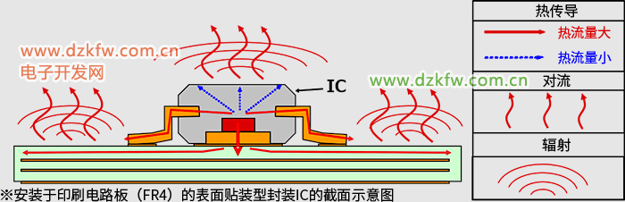 产生的热量通过传导、对流和辐射的方式经由各种路径逸出到大气中。由于我们的主题是“半导体元器件的热设计”,因此在这里将以安装在印刷电路板上的IC为例进行说明。